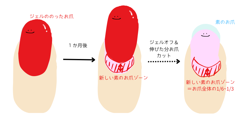 3か月~6か月でお爪が完全に生え変わるので、1か月でお爪全体のうち1/6~1/3の長さ分は新しいお爪が存在している状態になります。
