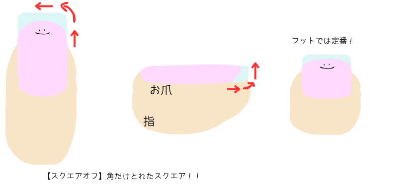また、巻き爪予防や靴の中で引っ掛かりにくいということでフットネイルに最も用いられるのもスクエアオフになっています。