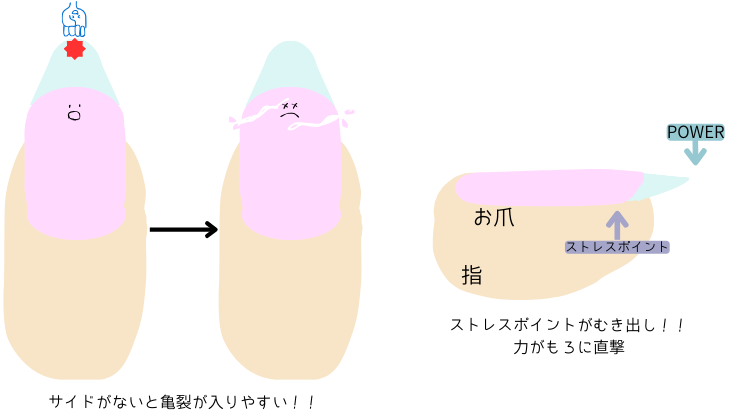 つまり、お爪が細くなればなるほど強度は小さく、お爪のサイドのラインに幅を出せば出すほど強度は大きくなります。