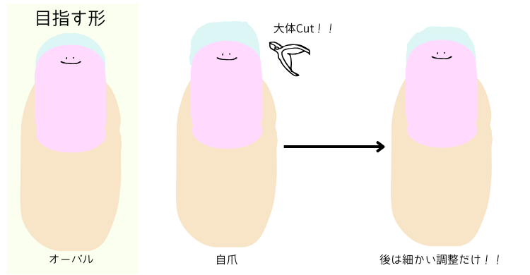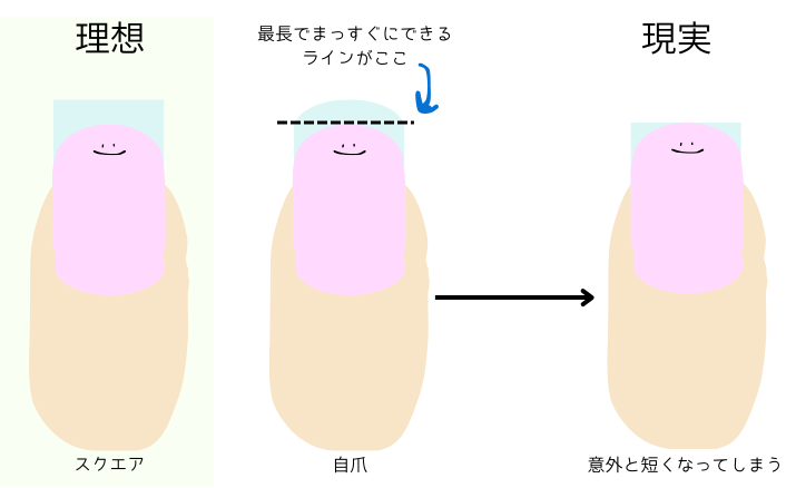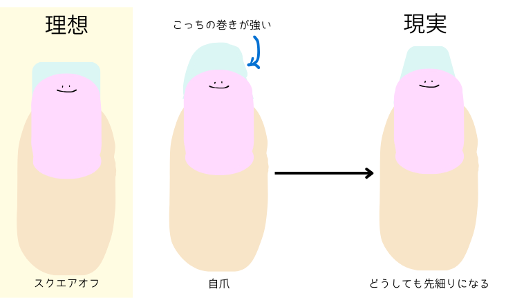 例えば、スクエアにしたいのに自爪のサイドの巻きが強くてどうしても先細りになったり、自爪の長さがたりず、思ったより短くなってしまう場合が考えられます。