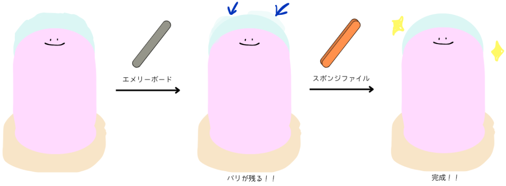 最後にスポンジファイルとよばれるスポンジ型のやすりを軽くお爪の削った面にかけ、バリをとったら完成です!!