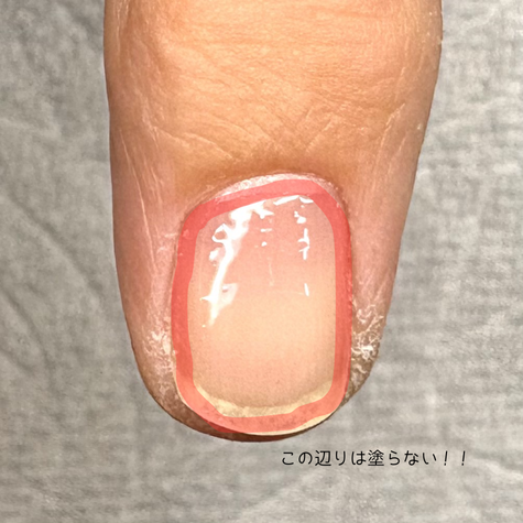 そうならないためにも本来のお爪の形よりも一回り小さくなるイメージでペロリンを薄く塗り込むようにしましょう。