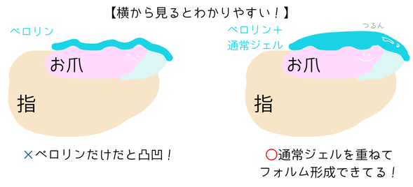そのためペロリン自身でフォルム形成をすることは難しく、上から通常のベースジェルを重ねてフォルム形成するのがおすすめなのです。