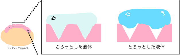 さらっさらの液体に含まれるHEMAやビスGMAがお爪表面の小さな隙間にまで入り込み、ジェルがしっかりお爪表面の凸凹をとらえられるようにしている。