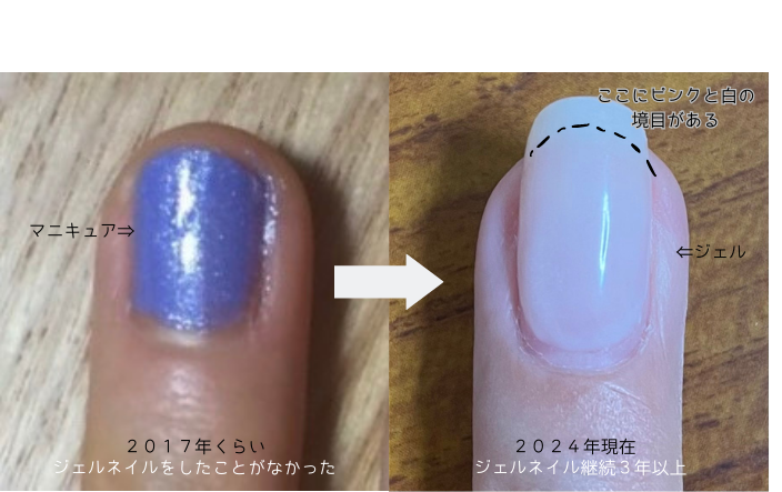 しかしネイリストになってからはたくさんのお客様のお爪を見たことと、私自身のお爪もジェルを続けているうちに、知らない間に育っていたことでこの現象を目の当たりにし、迷信ではなかったということを理解しました。