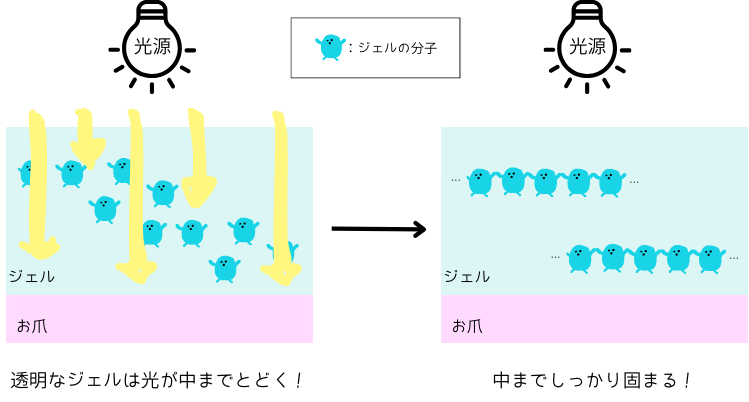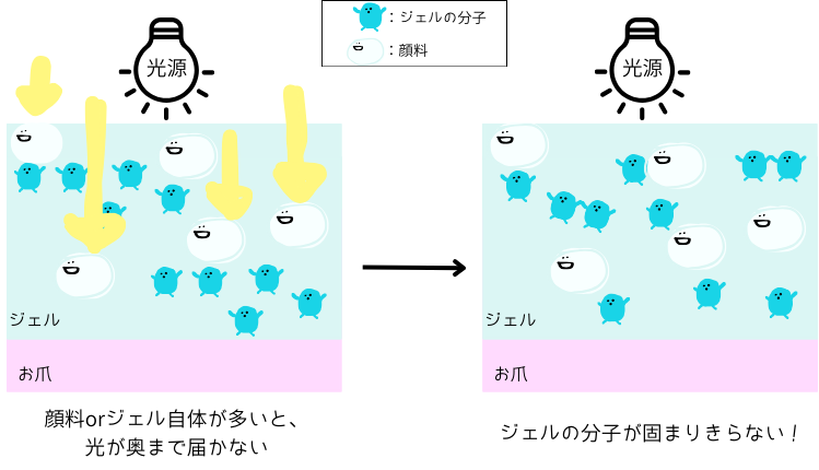 そのため、硬化に直接関係のない顔料が多すぎたり、ジェルが分厚すぎたりすると、結合すべき分子たち(特に内側にいるもの)に光が届きにくくなり、その結果硬化不良につながることがあります。